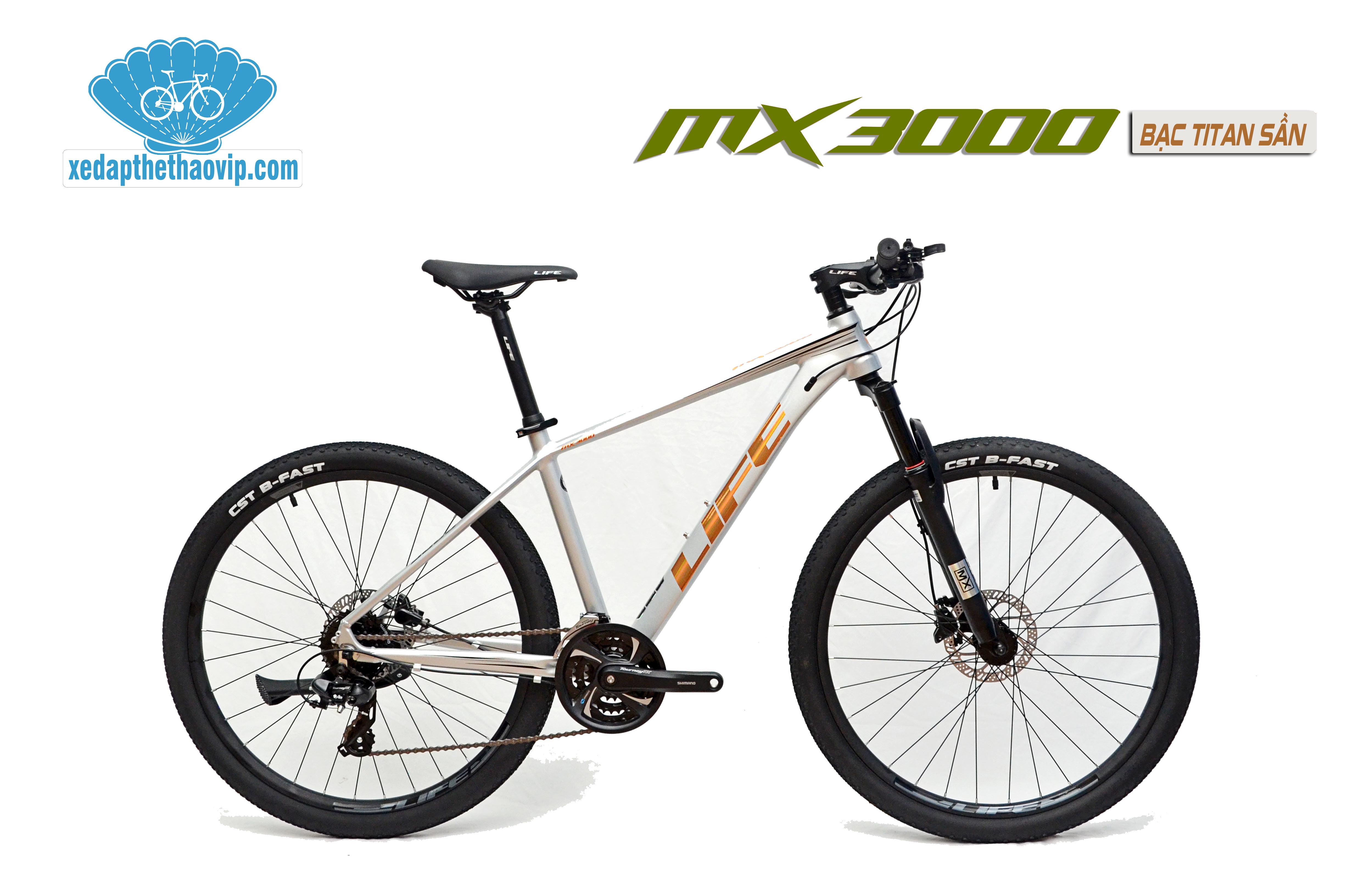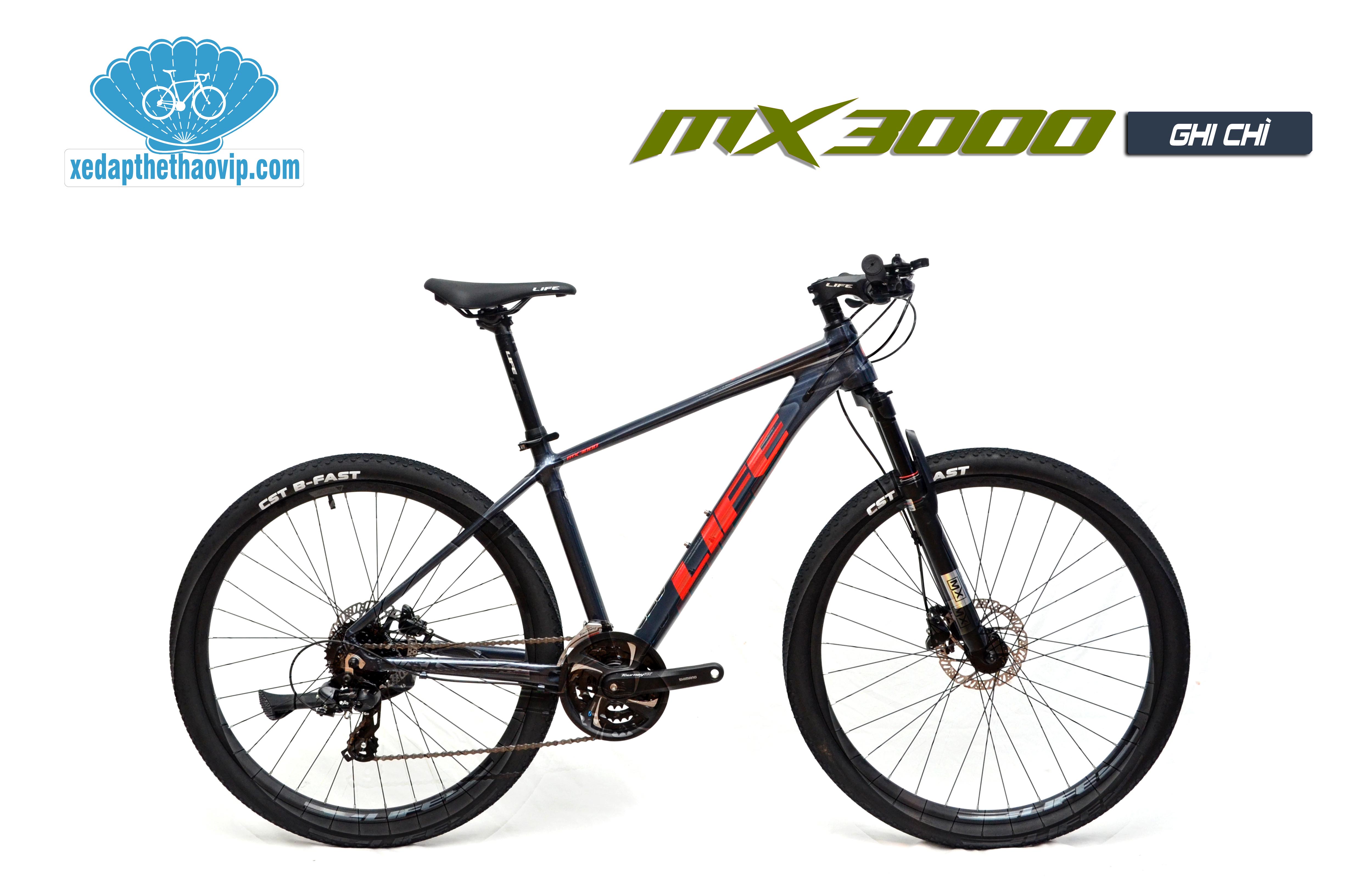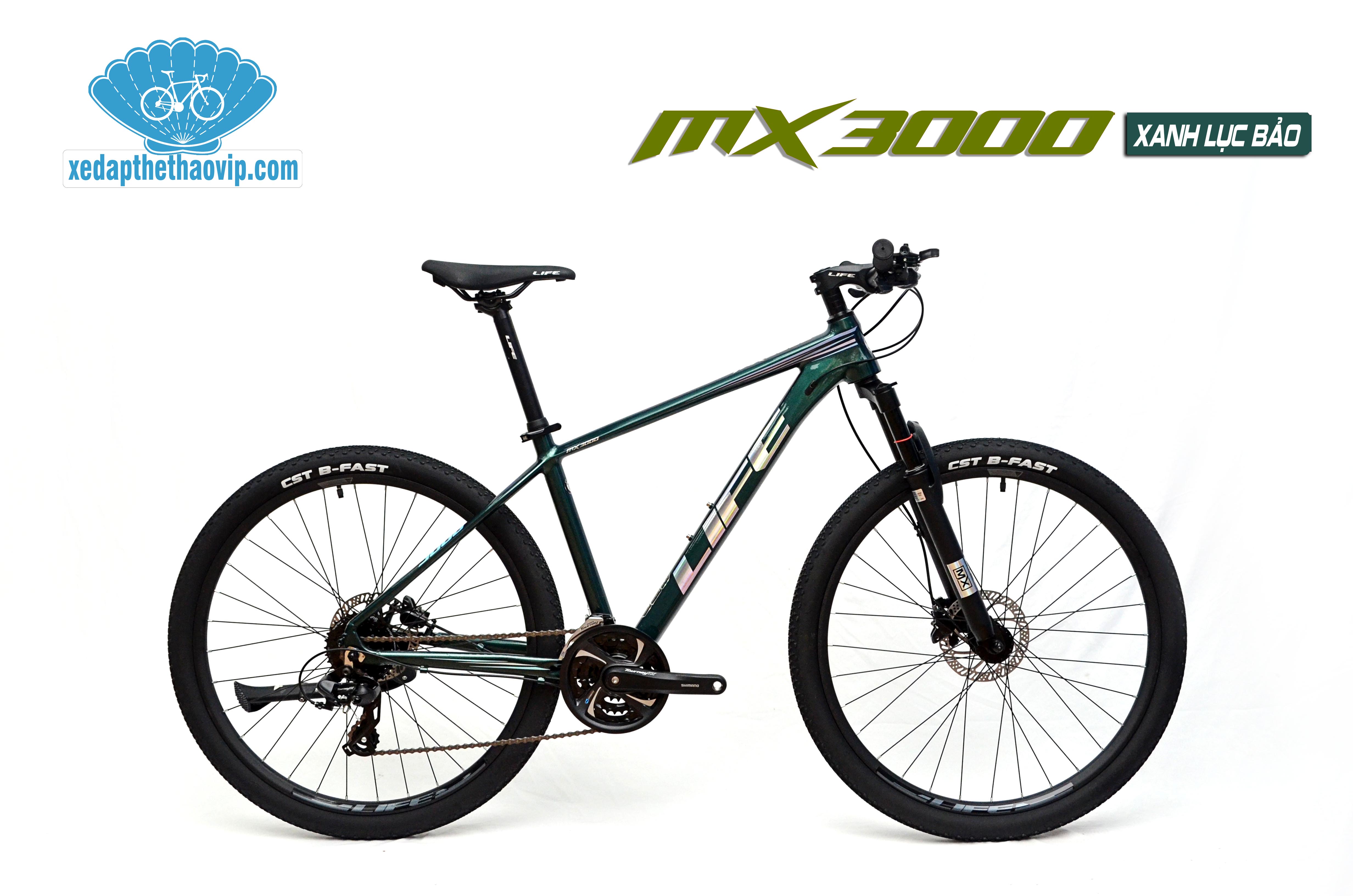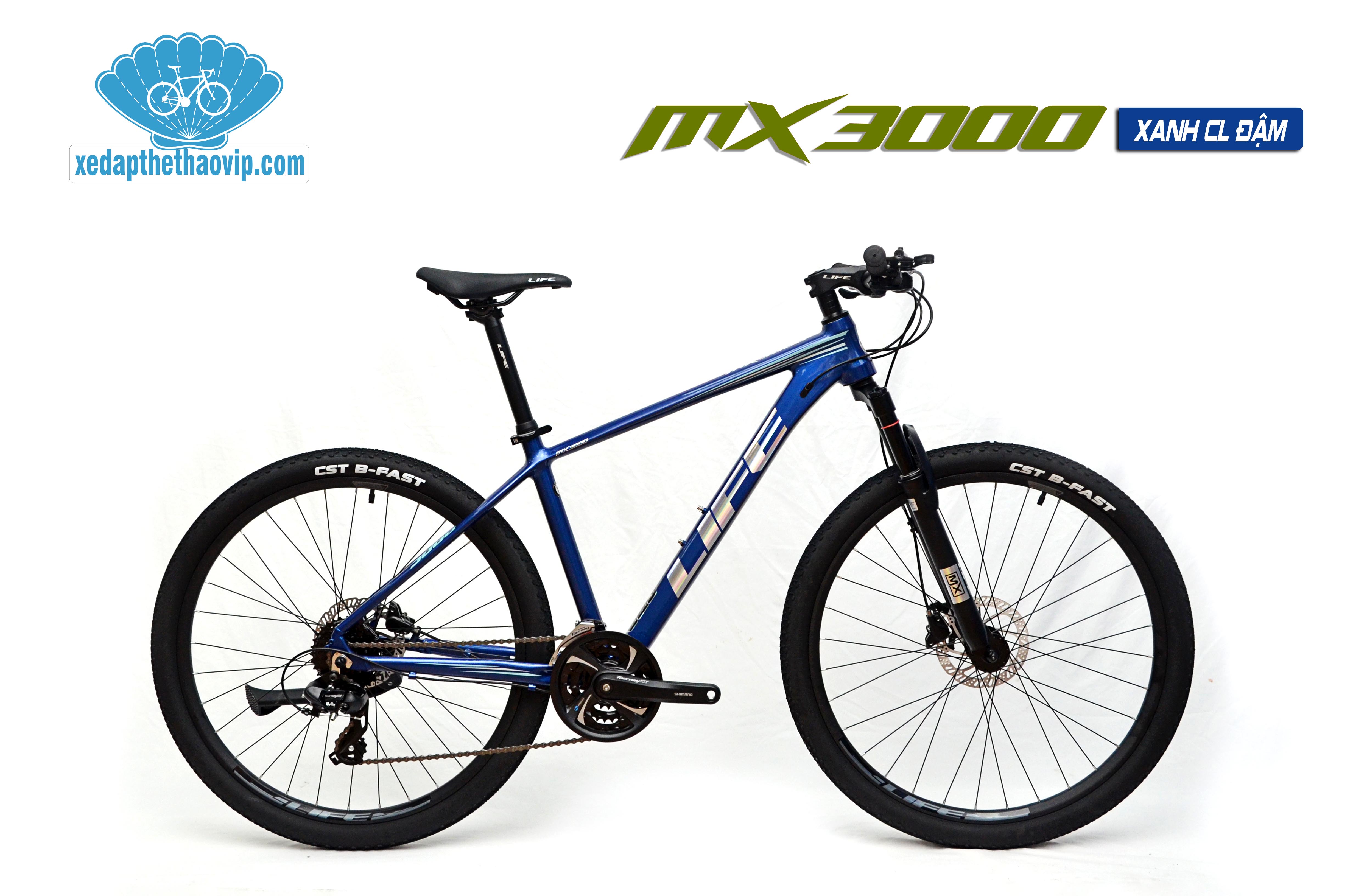 Xe đạp thể thao LIFE MX3000 được hãng xe đạp Life mới cho ra mắt thị trường. Thiết kế thời thượng mạnh mẽ Khung Nhôm không mối hàn, nhẹ, sơn tĩnh điện nhiều lớp, tem sơn. Phuộc giảm xóc, Bộ truyền động SHIMANO 3x8 tốc độ, phanh đĩa dầu SHIMANO cao cấp, bánh 27.5'' xe đạp nhẹ với moay ơ bi bạc đạn, trường xe, chạy mọi địa hình.