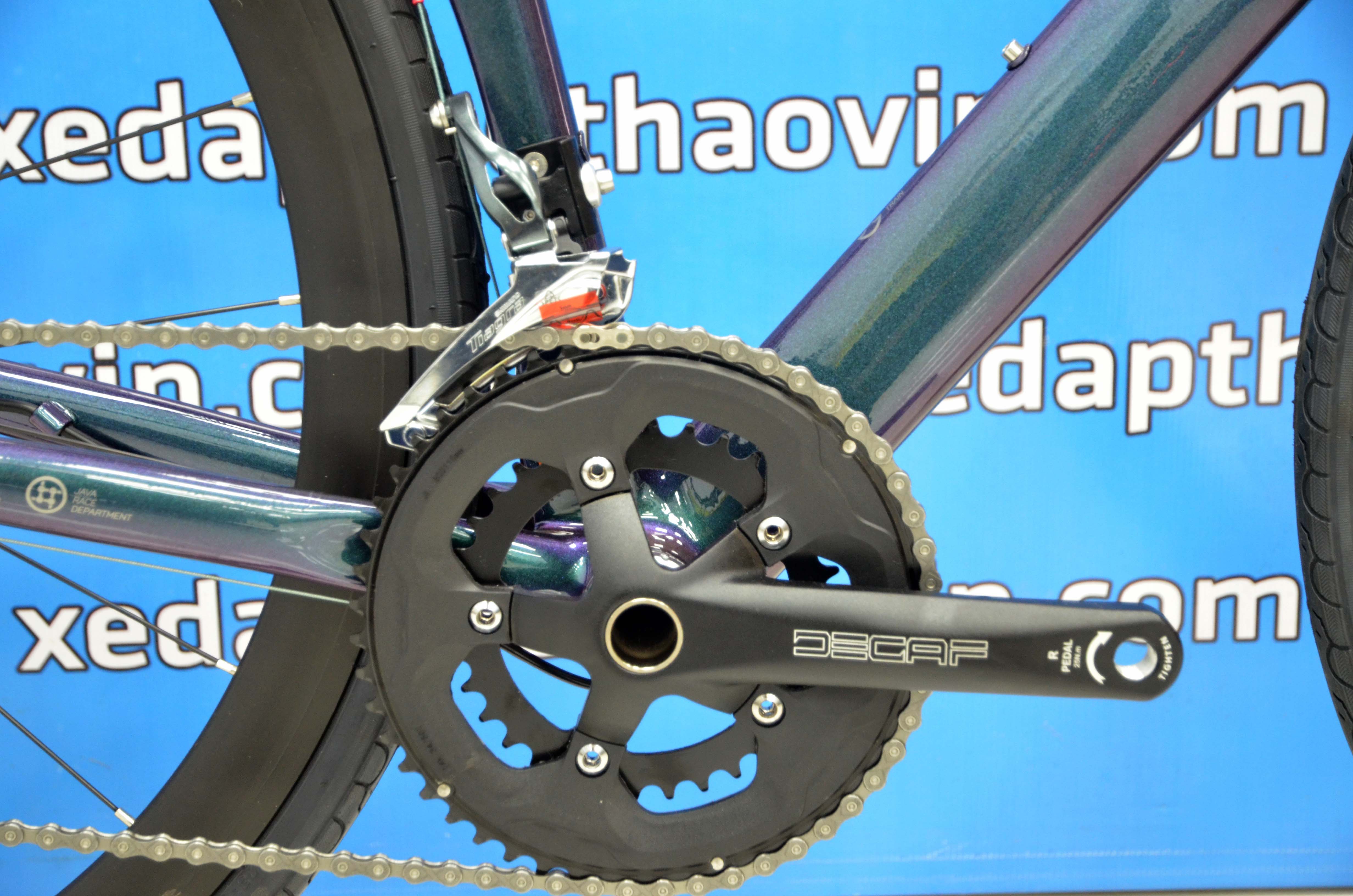 XE ĐẠP ĐUA JAVA SILURO6 Full Nhôm, càng bằng carbon, thiết kế chuẩn UCI, sơn cao cấp, cáp âm khung. Khung xe được hoàn thiện ở mức cao nhất đối với dòng xe khung Nhôm đó là thiết kế không mối hàn toàn phần. Đặc biệt trang bị tay lái liền pô tăng đầu cá mập bằng nhôm DECAF, Càng xe CARBON T800 thiết kế khí động học, giúp giảm lực cản đối đa lực cản của gió. Xe trang bị bộ truyền động SHIMANO Tiagra 4700 Japan – 2x10 tốc độ. Đùi đĩa Trục Rỗng DECAF. Phanh đĩa dầu. Xe sử dụng Moay Ơ Bạc Đạn rất chớn bút trục to.
